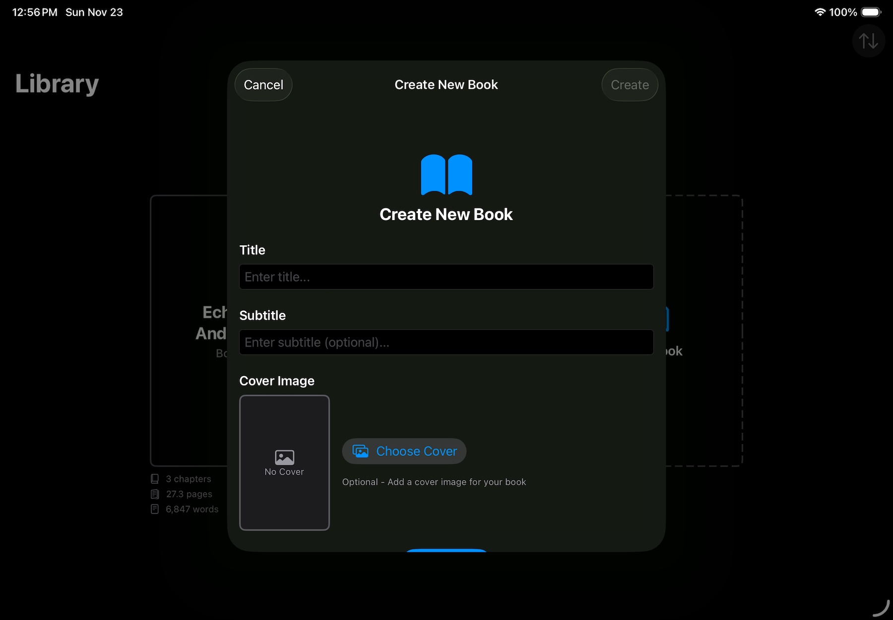 Chapters is a minimalist writing tool. It’s purposefully simple to allow you to focus on writing without distraction. Start by tapping ‘Create Book’ from the library view. Here you add your title, and optionally a subtitle or even some cover art for inspiration.