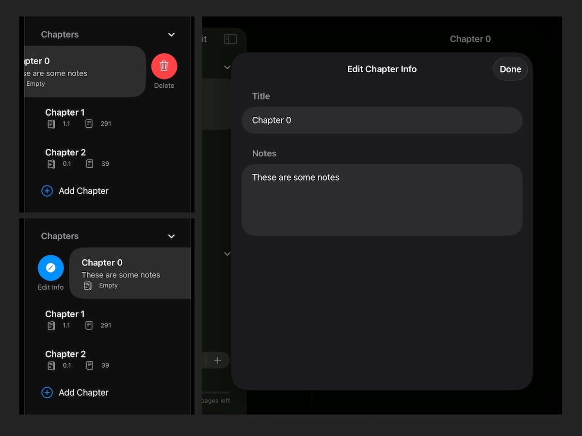 Once created, tap to head into the main editing view. On the left you’ll see your chapters, which you can add, edit, reorder and delete with a few simple controls. Swipe right to delete. Swipe left to change the chapter name and also add your own notes.
