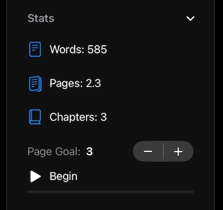In the stats panel you can see your overall progress, we use a simple 250 words per page calculation. Within here there is a little goal tool that you use to help you make regular progress on your next amazing story. Just select the page count you’re aiming for and hit begin.
