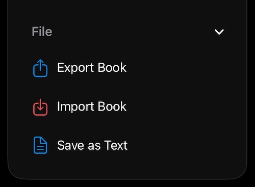 Your book is backed up with iCloud if you’re signed in with Apple and syncs across your devices seamlessly. However if you’re writing a major work you can also enjoy the additional safety of exporting the book as a backup. Note the file is simple .json and you can open that in any other text editor.