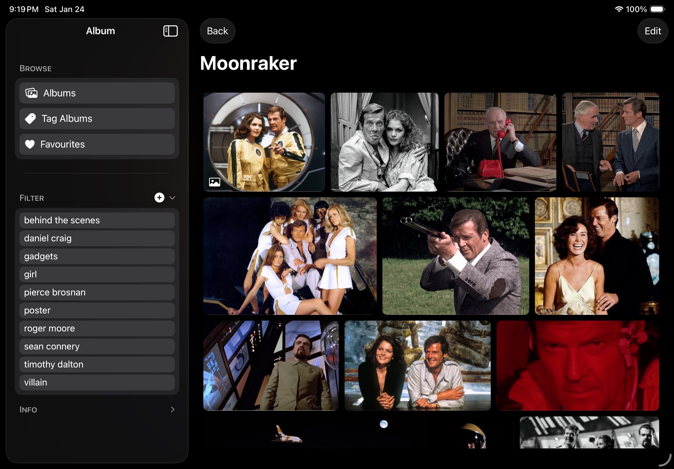 One neat feature is the flexible tagging system. You can tag individual photos or entire albums with custom tags. In the sidebar, you’ll see all your tags listed - simply tap any tag to filter your view to only photos with that tag. You can select multiple tags to create AND filters (photos must have all selected tags to appear).