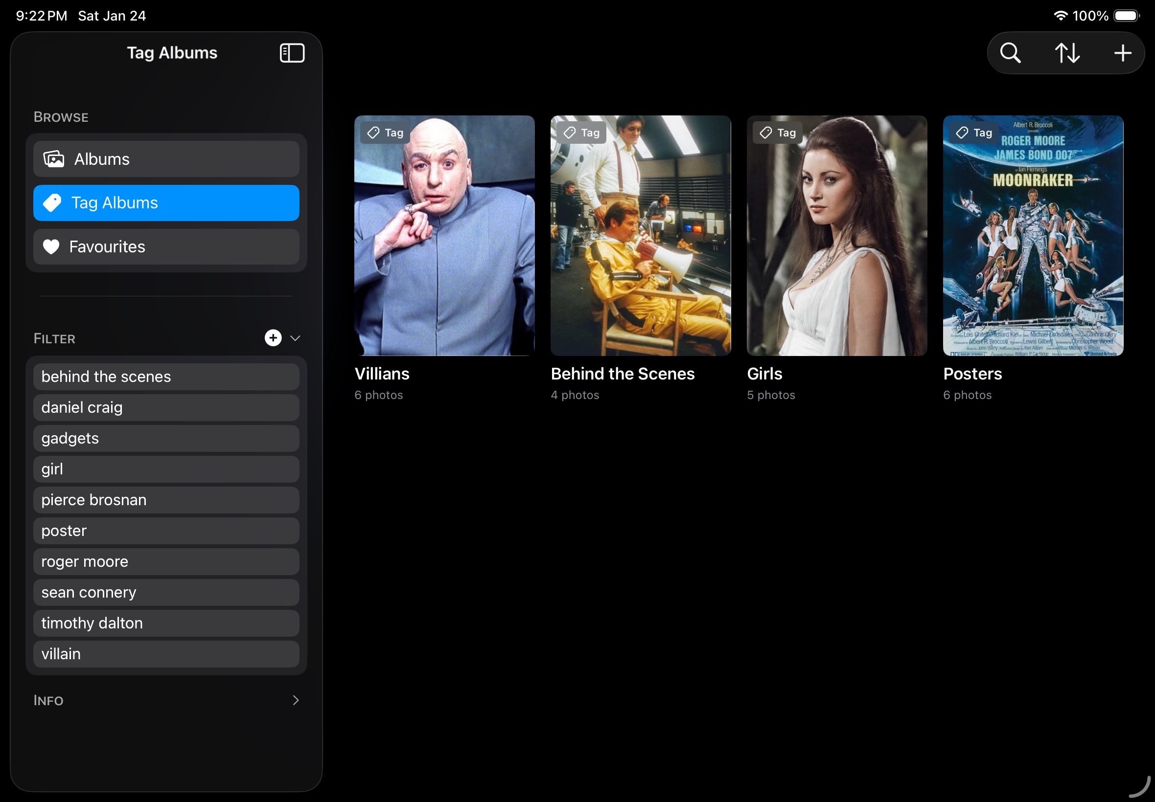 Tag Albums are dynamic collections that automatically show photos matching specific tags. Create a Tag Album by tapping the plus button and selecting ‘New Tag Album’. Choose which tags to include, and the Tag Album will always display photos that have all those tags, no matter which album they’re stored in. It’s perfect for cross-cutting views like “Summer + Beach” or “Portfolio + Completed”.