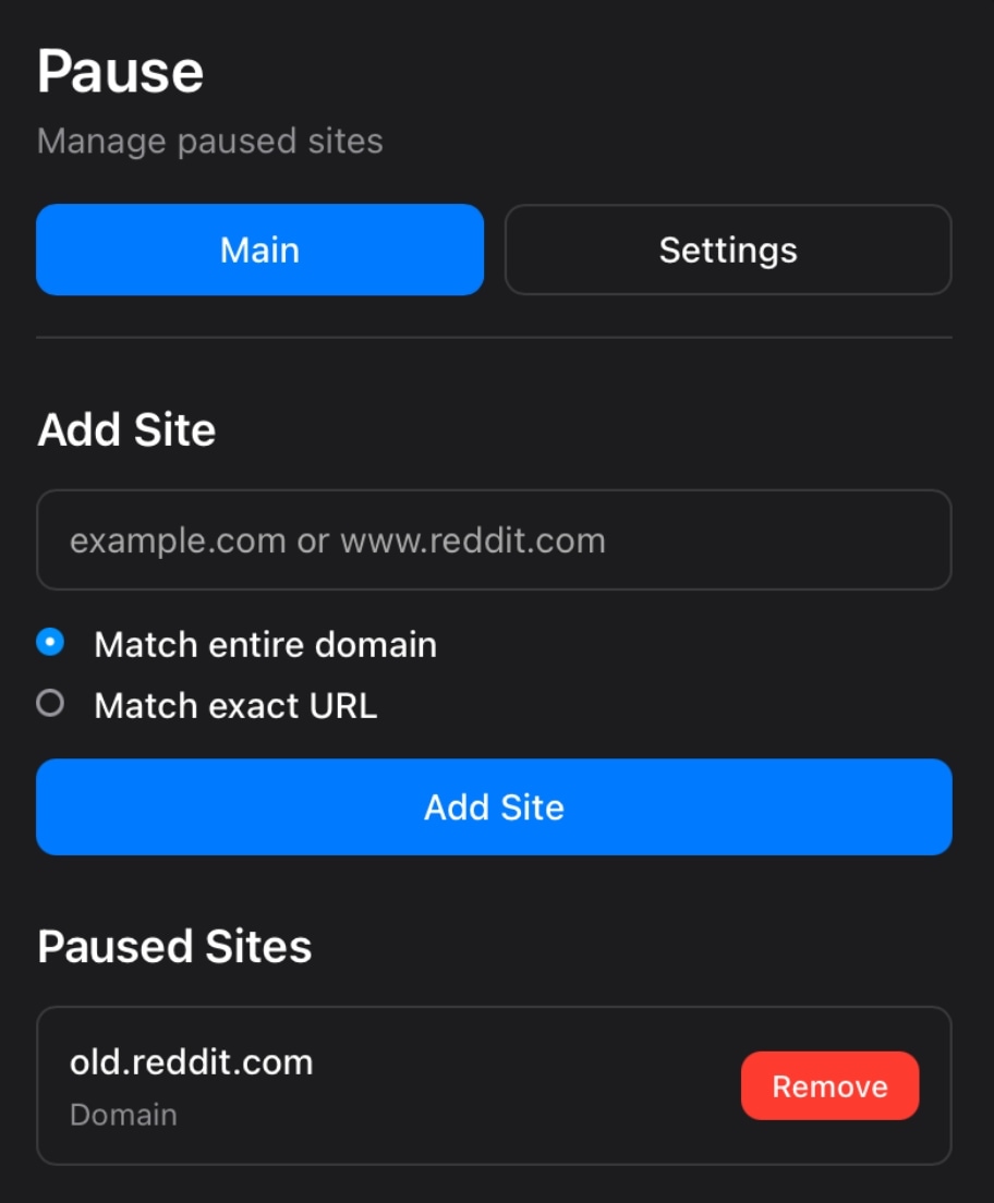 From the main view, you can add websites to your pause list. Enter the domain or URL in the input field — for example, “twitter.com” or “www.reddit.com”. Choose whether to match the entire domain or just the exact URL, then tap “Add Site” to add it to your paused sites list.