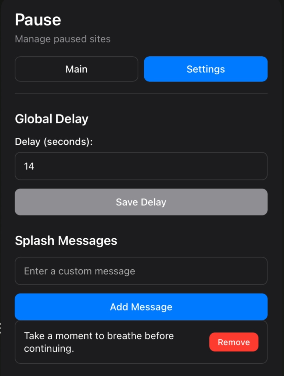 Add personalized mindfulness messages that will appear during the pause. These gentle reminders help you take a moment to breathe and reconsider before continuing. Enter your custom message in the text field and tap “Add Message” to add it to your collection. You can add multiple messages, and they’ll be shown in succession during pauses. To remove a message, simply tap the red “Remove” button next to it.