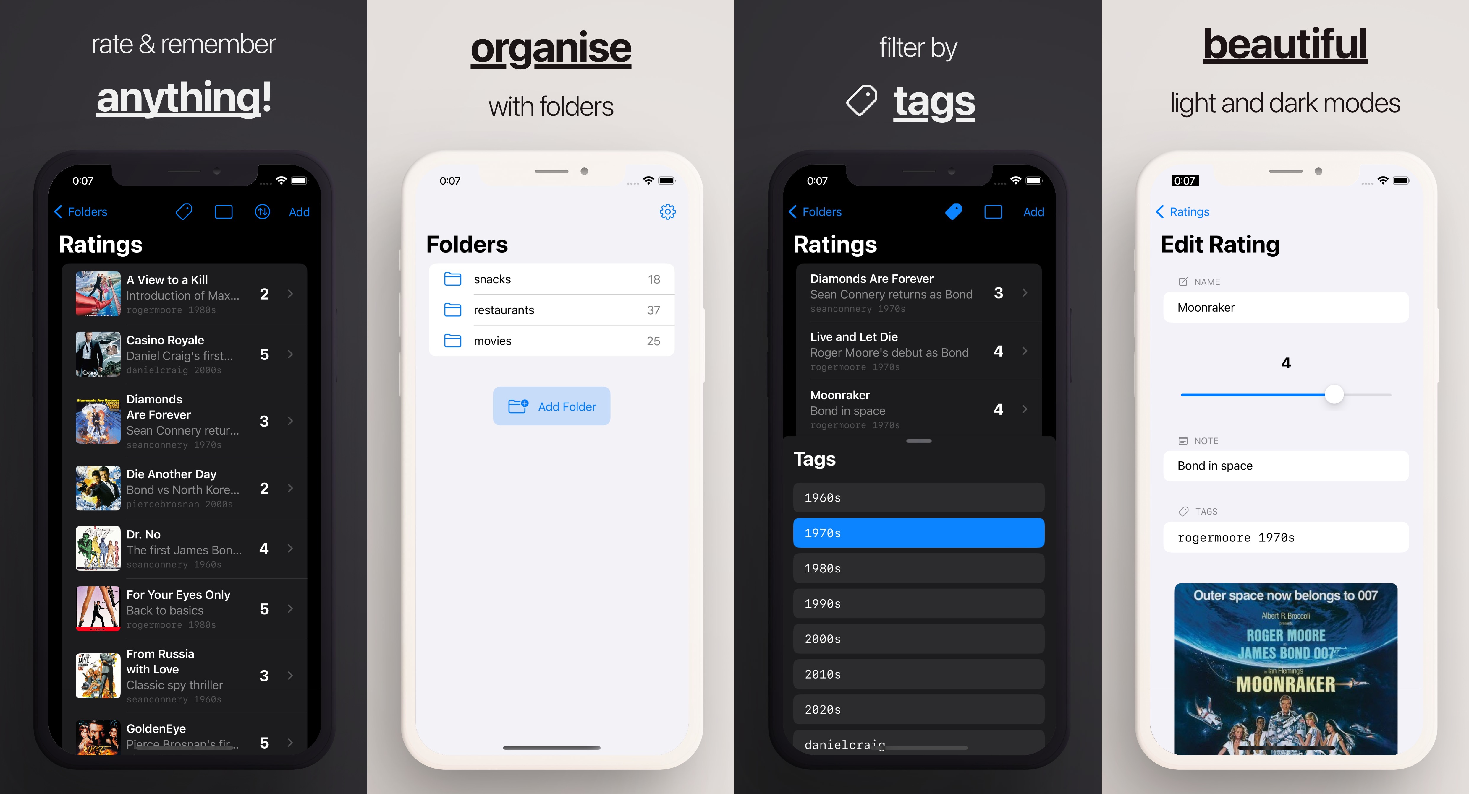 A wee wonderful app designed to make rating and remembering things easy. Syncs across your devices with iCloud. Available for both iPhone and iPad.