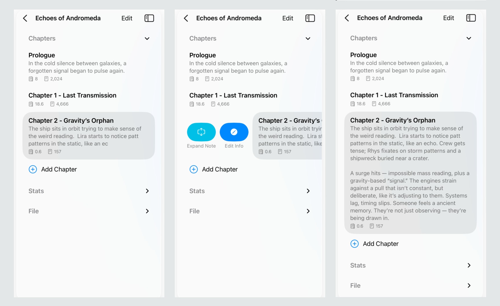 The notes feature in Chapters had kind of been niggling at me, and I think i’ve made significant improvement to the feature. Now you can see three lines be default instead of just two which I think is a big help on it’s own. But if you want to easily refer to a long one now you can swipe from the leading edge and expand and collapse a complete note which I think makes them super helpful.